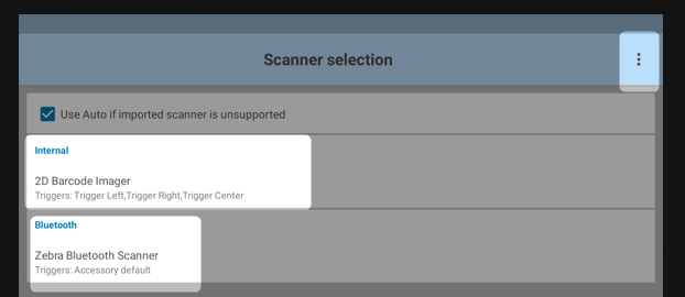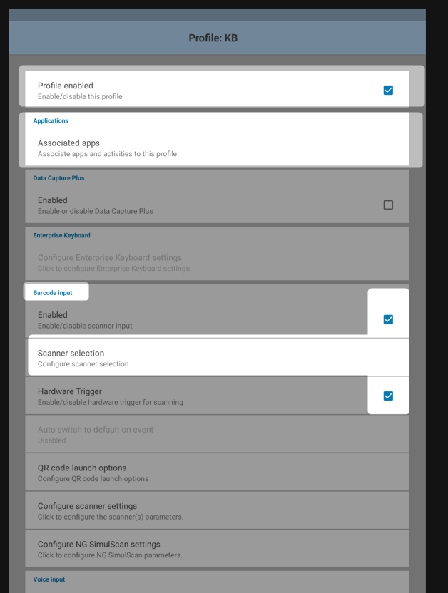 - Gå ind i DataWedge Profilen - og ret skanner selection under "Barcode Input" Hvis man siger auto under knapper i højre hjørne skifter den ofte bare til Zebra Bluetoth Scanner - og virker direkte med Bluetoth skanneren - men ikke længere med den interne. Det er muligt under knappen i højre hjørne, ADD SKANNER at tilføjde både intern 2D og extern "Zebra Bluetoth scanner" Så kan begge benyttes. Vi havde lidt problemer med 2 samtidige BT skannere :-)