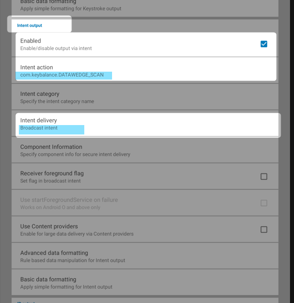 - "Intent action" skriv "com.keybalance.DATAWEDGE_SCAN" - BEMÆRK COM!!!