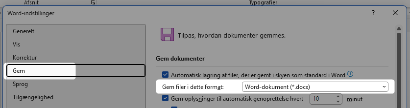 Fremfor at danne og gemme et dokument popper word op med denne opsætning