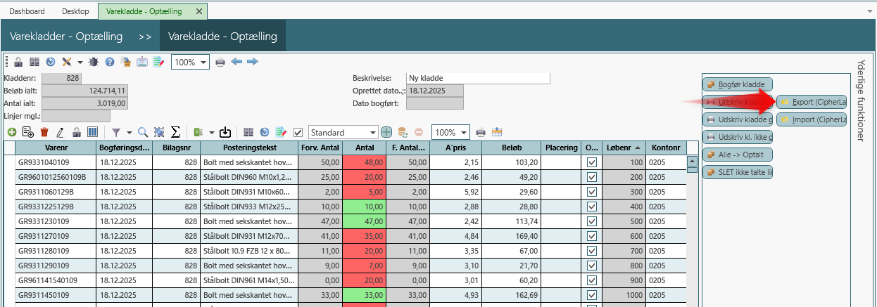 I Optællingskladden kan vi så efter optællingen på lageren med skanneren importer talene til Keybalance.