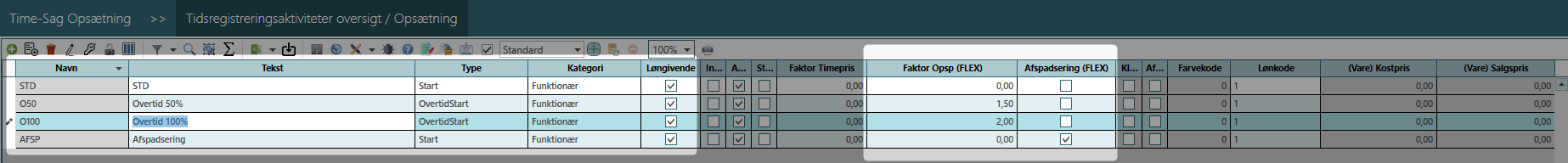 - Opret Ydelser Standard - Start - Funktionær O50 - OvertidStart - Funktionær - FaktorAntal = 1,5 O100 - OvertidStart - Funktionær - FaktorAntal = 2 Afsp - Start - Afspadsering = true, Løntimer = TRUE!