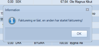Fakturering er låst, en anden bruger har startet fakturering! Hos en del kunder er der lavet lås imod flere samtidige masse-faktureringer. Så får bruger 2 denne meddelse. Normalt kan den frigives under KØRSLER > SALG > Frigiv fakturalås