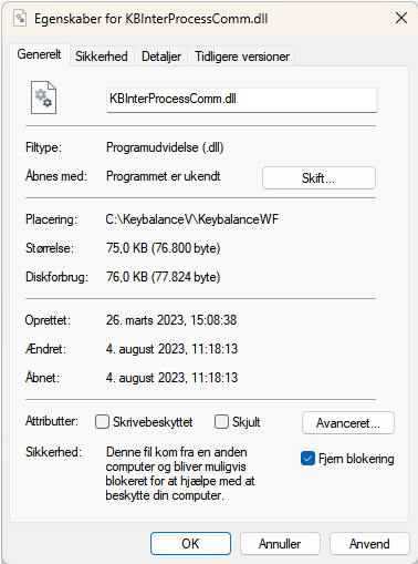 Hvis man trykker egenskaber på en .dll man har hentet kan man se om den er blokeret eller ej.
