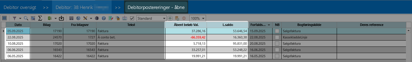Feltet Løbende saldo aka L.Saldo giver derfor ikke den store mening at indsætte i f.eks. tabellen "ÅbnePoster" på en debitor eller kreditor, da de åbne poster ikke nødvendigvis kommer sammenhængede lige efter hinanden.