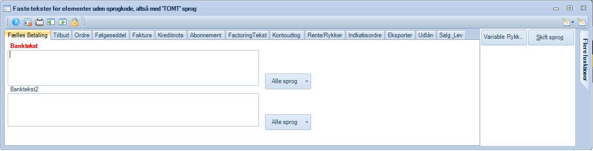 Derfor skal man huske at skrive teksten på alle de sprog, man har opsat i KeyBalance (såfremt man bruger alle). Har man fx en debitor med et påsat sprog, man har lavet en ordre på, skal man huske at få indsat teksten i sproget. Dette gøres ved at trykke på knappen "Alle sprog", dobbeltklikke på sproget og indsætte teksten: