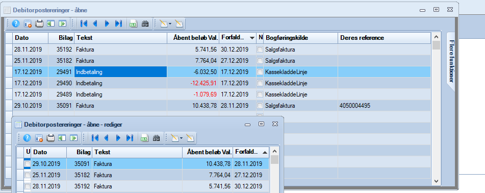 Det er også muligt at redigere åbne poster efter bogføringen. Dette gøres ved at markere en åben post og trykke F8. Herfra vises alle åbne poster med modsat fortegn (og samme valuta). Nu kan en eller flere af posterne afkrydses som udlignet. Dermed tælles den åbne værdi ned på de 2 poster. Når værdien rammer 0, er posten lukket.