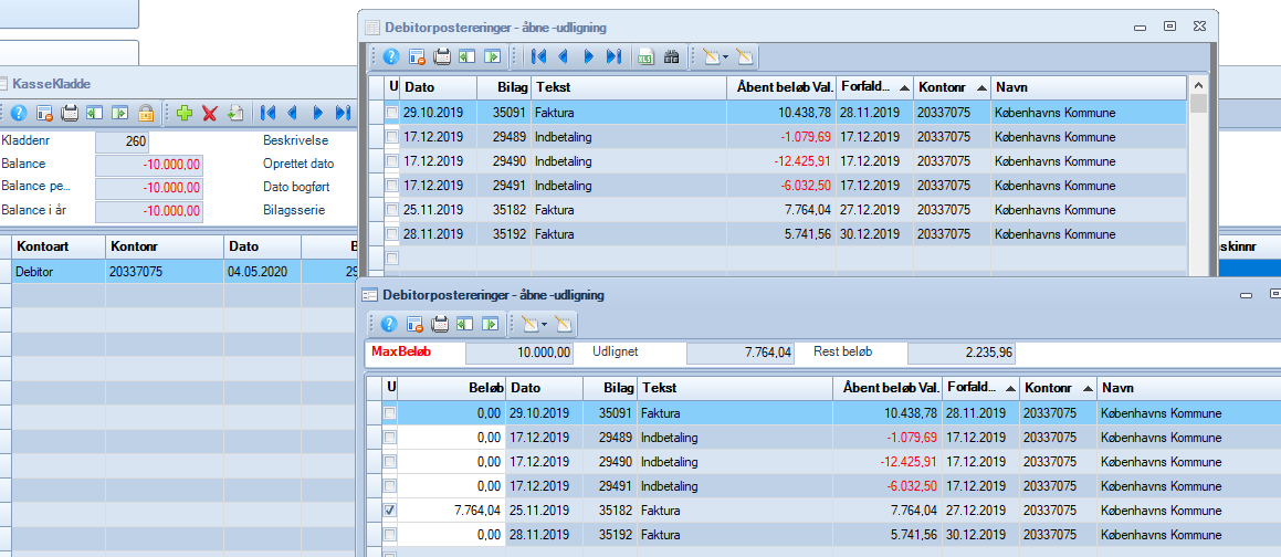 F9 markerer en række åbne poster til udligning af én indbetaling. Her er det