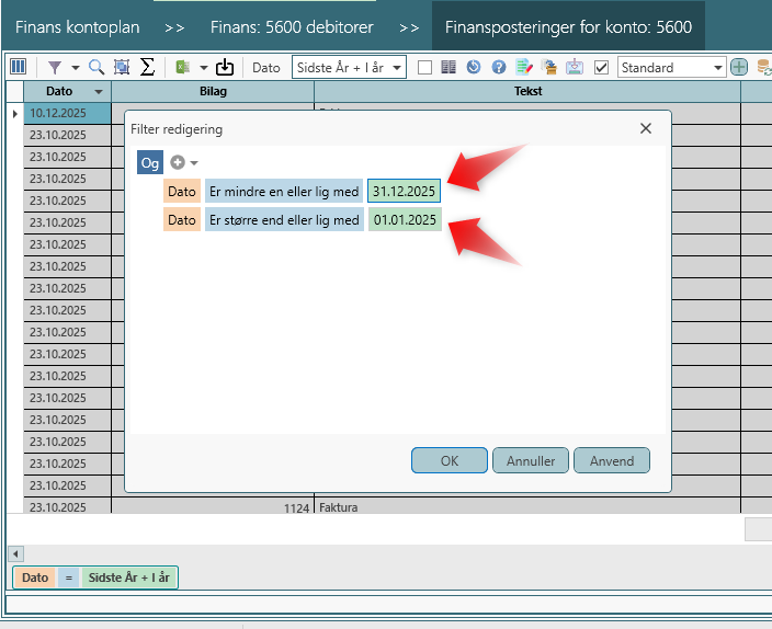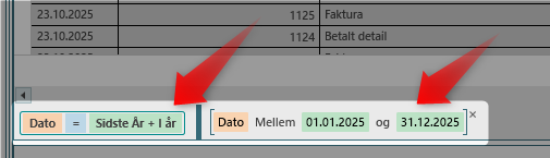 For at filtrer som i gammel klient 01.01.2025..31.12.2025 Skal man gøre følgende: