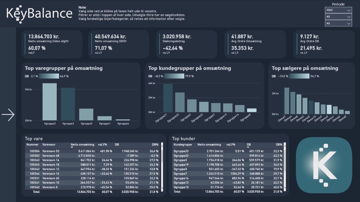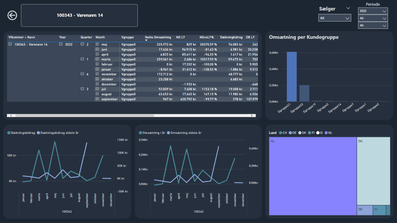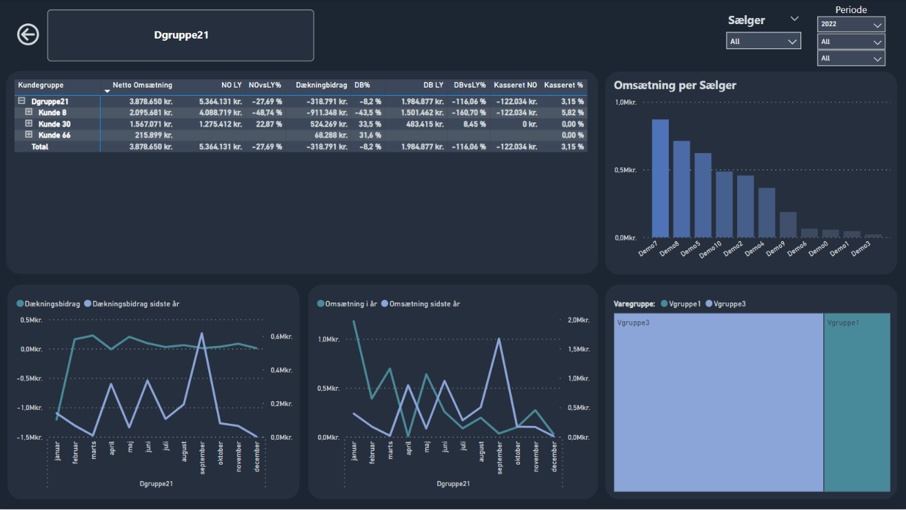 (Derudover har standard opsætningen også 2 drill through sider, som ikke er tilgængelige på URL linket – en på vare og en på kundegrupper/kunder)